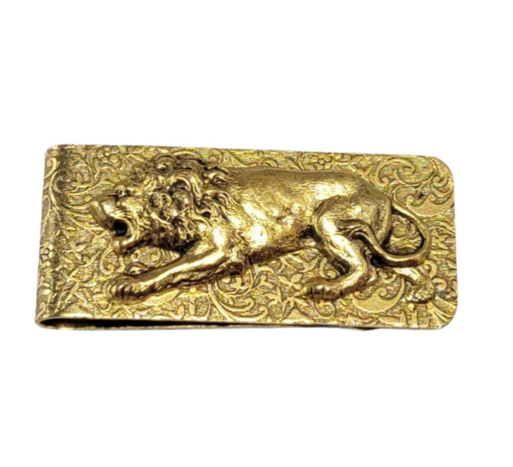 A refined golden color money clip featuring an embossed lion detail, designed for a bold yet elegant everyday carry.