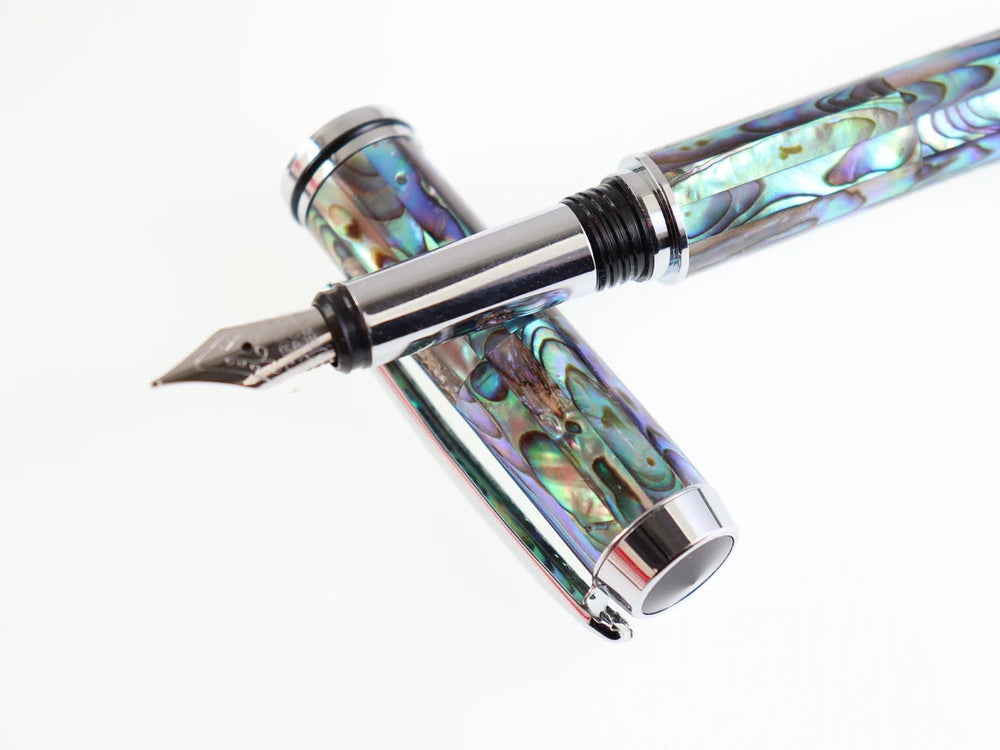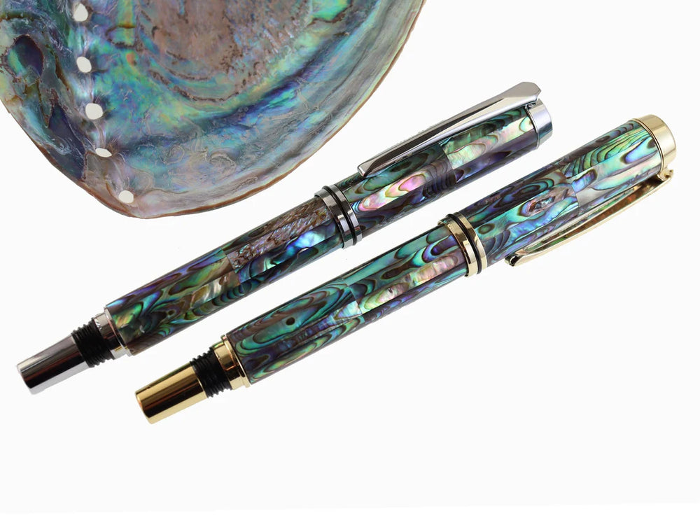 Two handcrafted mother of pearl fountain pen, combining timeless elegance, artisanal craftsmanship and refined writing performance.